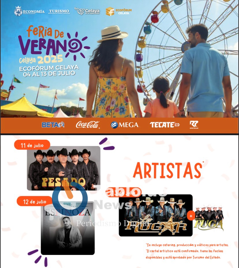 Celaya, Gto., viernes 27 de junio del 2027. Espinoza Paz, Grupo Pesado, Los Rugar y 45 Grados, son parte del elenco que estará presentándose en la Feria de Verano 2025 en el Ecofórum de Celaya, del 04 al 13 de Julio. El costo de la entrada al recinto es de 50 pesos, aunque los niños que no rebasen cierta altura y los adultos mayores podrán entrar gratis.